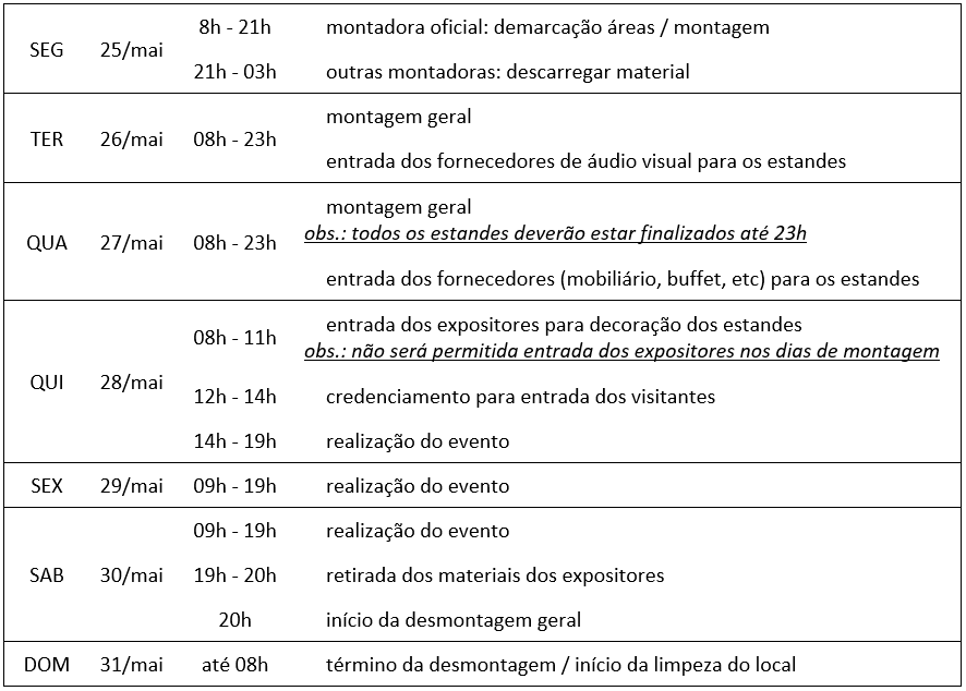 (*) = o ideal é que às 12h do dia 28/05/2026 todos os estandes já estejam prontos e com pessoal para começar a receber os visitantes que começam a chegar.